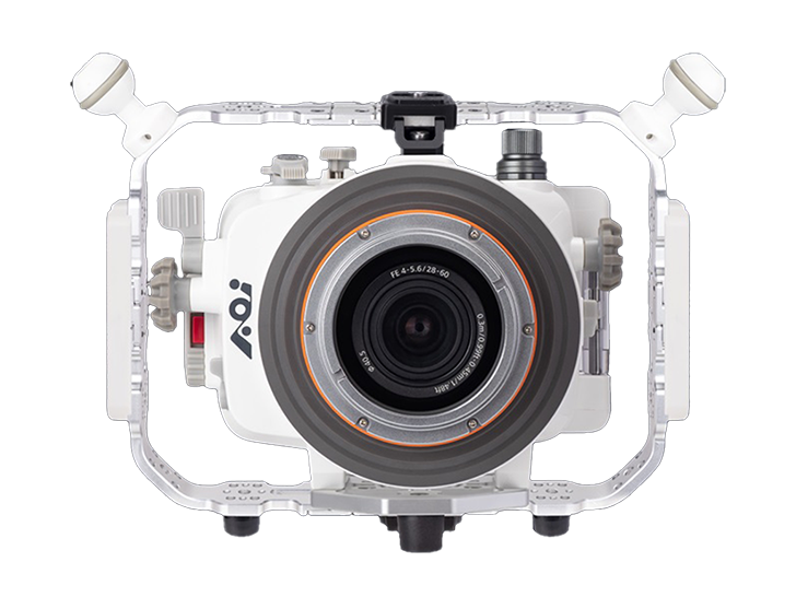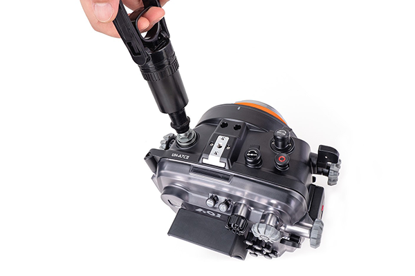 AOIハウジング独自のバキュームリークシステム、モイスチャーセンサーを搭載。カメラとハウジングの接続は、ホットシューコネクターでコードレス接続ができます。